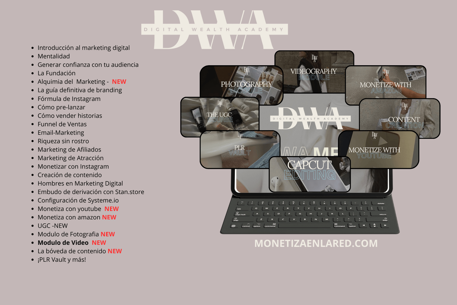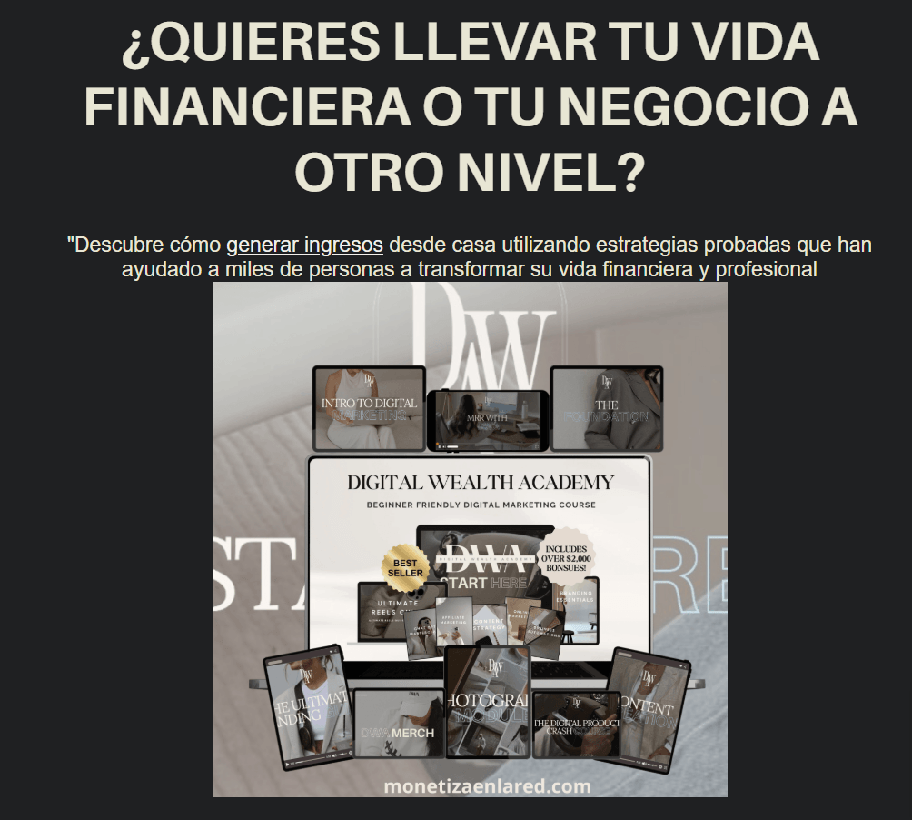 Digital Wealth Academy es la academia definitiva de marketing digital, negocios digitales y automatizaciones, con más de 600 lecciones diseñadas paso a paso, especialmente para principiantes y personas con nivel intermedio.